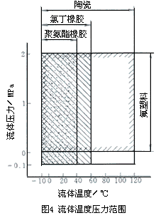 | (1) 襯里材料(或直接與介質接觸的測量管) 常用襯里材料有氟塑料、聚氨酯橡膠、氯丁橡膠和陶瓷等。近年有采用高純氧化鋁999.7%AI2O3)陶瓷制成襯里的,但只限中小口徑傳感器。 氯丁橡膠和玻璃鋼用于非腐蝕性或弱腐蝕性液體,如工業(yè)用水、廢污水及弱酸堿,價格*為低廉。氟塑料具有優(yōu)良的耐化學腐蝕性,但耐磨性差,不能用于測量礦漿液。氟塑料中*早應用的是聚四氟乙烯,因與測量管間僅靠壓貼,無粘結力,不能用于負壓管道,后開發(fā)各種改性品種,實現(xiàn)注塑成形,與測量管有較強結合力,可用于負壓, 聚氨酯橡膠有極好的耐磨耗性,但耐酸堿的腐蝕性較差。它的耐磨性相當于天然橡膠的10倍,適用于煤漿、礦漿等;介質溫度要低于40~60/70℃。氧化鋁陶瓷有極好的耐磨耗性和對強酸堿的耐磨腐蝕性,耐磨性約為聚氨酯橡膠的10倍,適用于具有腐蝕性的礦漿;但性脆,安裝夾緊時疏忽易碎,可用于較高溫度(120~140/180℃)但要防止溫度劇變,如通蒸汽**,一般溫度突變不能大于100℃,升溫150℃ 要有10min時間。 通用型EMF幾種材料的壓力溫度大體適用范圍可參閱圖4。 | |